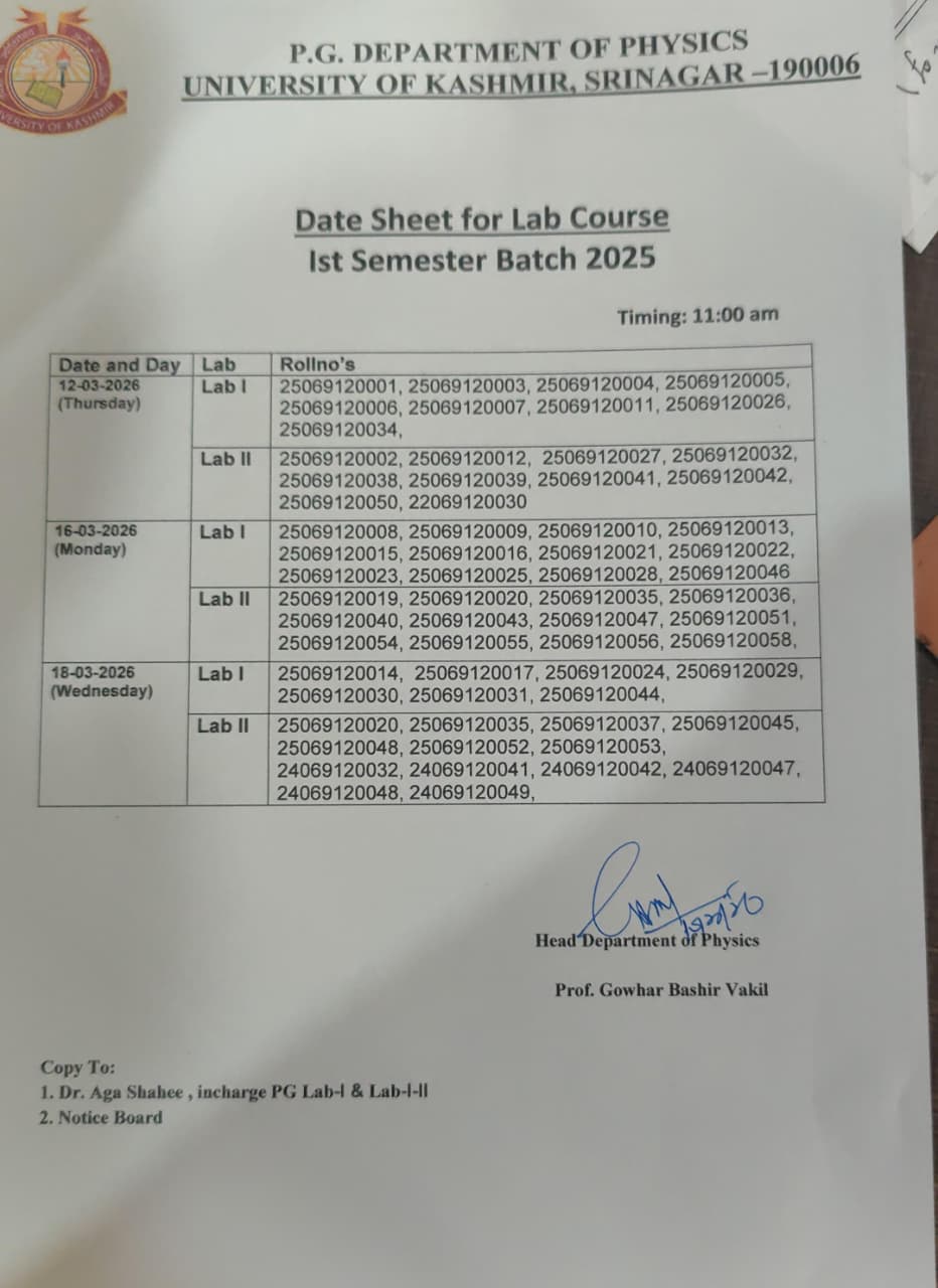 The Department of Physics was established in 1962 in the University Campus, Hazratbal, of the erstwhile Jammu and Kashmir University, Srinagar to impart teaching and training to the students from J & K State leading to the Master’s degree in Physics. Prior to the establishment of the Department in the valley, desirous students from the state had to go outside the state to obtain their Master’s degree. Of the 25 students inducted in a batch, admissions to 50% seats were reserved for candidates representing Jammu province and Kashmir province respectively. The admission policy co